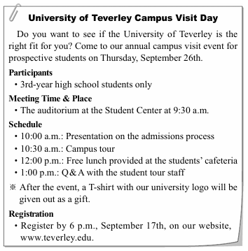 27. University of Teverley Campus Visit Day에 관한 다음 안내문의 내용과 일치하지 않는것은? ![]() ① 고등학교 3학년 학생만 참여할 수 있다. ② 입학 절차에 관한 소개가 예정되어 있다. ③ 점심은 무료로 제공되지 않는다. ④ 티셔츠가 선물로 주어질 것이다. ⑤ 등록은 학교 웹사이트에서 한다. |