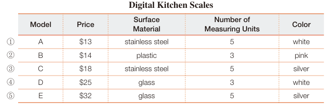 다음 표를 보면서 대화를 듣고, 두 사람이 주문할 디지털 주방 저울을 고르시오. W: Honey, are tou checking your social media? M: No, I'm looking at a site that sells baking supplies. We should get a digital kitchen scale. W: Great idea. Since we got the nes oven, wd'll be baking more. M: Right. [pause] Here are the site's five best-selling models. This one is pretty expensive. W: Yeah. Let's keep it under $30. M: Okay. I'd prefer to buy one that's made of stainless steel or glass. Germs don't stick as much, so they're cleaner. W: That makes sense. And how many measuring units do you think we need? M: Hmm. I think we'll need at least four different units such as gram, ounce, and pound. W: Okay. Then we should get one of these two. Which color do you preter? M: I think silver would look better in our kitchen. W: I agree. So let's order this one. ![]() |