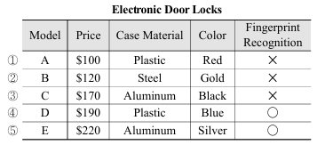 10.다음 표를 보면서 대화를 듣고, 남자가 주문할 전자 도어 록을 고르시오. W: Honey, we need to change the electronic door lock on the front door. M: Yeah. So I’ve been looking online to find a replacement. W: Have you found any good options? M: These five look promising. Take a look. What do you think? W: Well, I don’t want to spend more than $200. M: Okay. How about the case material? W: Definitely not the steel one. It looks old-fashioned. M: I agree. And, I don’t like the red one. W: Yeah, it wouldn’t go well with our door. M:Now, we’re down to these two. Do you think we need the fingerprint recognition feature? W: I don’t think we’ll use it much. Let’s choose the one without it. M: Sounds like a good choice. I’ll order this one. ![]() |