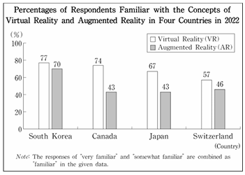 25. 다음 도표의 내용과 일치하지 않는것은? ![]() The graph above shows the percentages of respondents who were familiar with the concept of virtual reality (VR) and those who were familiar with the concept of augmented reality (AR) in four countries in 2022. ① For each country, the percentage of respondents familiar with VR was greater than the percentage of respondents familiar with AR. ② The country with the highest percentage of respondents familiar with AR was South Korea. ③ The country with the largest gap between the percentage of respondents familiar with VR and that of respondents familiar with AR was Canada. ④ In Japan, the percentage of respondents familiar with VR was greater than 60%. ⑤The percentage of respondents familiar with VR and that of respondents familiar with AR were lower in Switzerland than in Japan, respectively. |