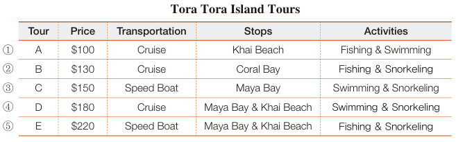 다음 표를 보면서 대화를 듣고, 두 사람이 예약할 투어를 고르시오. M: Darling, I brought this brochure from Tora Tora Island Tours. They offer some amazing tours. W: Wonderful! We're planning to visit there next month. Let me have a look. [Flipping sound] These all sound fun. M: Absolutely. I personally like this one the most, but I'm afraid it might exceed our budget. W: Right. Let's keep it under $200. Also, this tour won't work for me. I can't be on a speed boat. M: Really? I find it quite thrilling. W: I know, but I would definitely get seasick. M: I see. So we need to choose one of these three options. Do you have any preference regarding the stops? W: Well, I've heard that Coral Bay tends to get really crowded. Let's skip that one. M: Agreed. That lesves us with these two choices. I love snorkeling. W: Me, too! Let's go ahead and book this one. M: Perfect! I can't wait to go. ![]() |