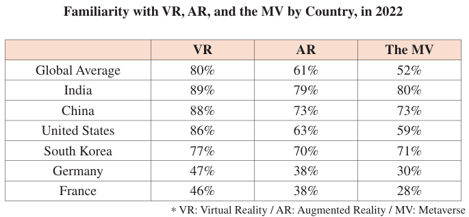 다음 표의 내용과 일치하지 않는 것은? ![]() The table above shows the percentages of familiarity with the concepts of VR, AR, and the MV by country, in 2022. ①Despite the global average familiarity with VR being 80%, France had a familiarity rate with VR that was 34 percentage points lower than the global average. ②India had the highest familiarity with all three technologies, with VR at 89%, AR at 79%, and the MV at 80%, followed by China, which ranked second among the six countries in familiarity with all three technologies. ③Germany had lower levels of familiarity with all three technologies compared to the global average, and for the familiarity with the MV, the gap between the global average and Germany was more than 30 percentage points. ④Regarding the global average, familiarity with AR was higher than that with the MV, but in India and South Korea, familiarity with the MV exceeded that with AR. ⑤While the United States showed higher familiarity with VR compared to South Korea, South Korea had higher familiarity with both AR and the MV than the United States. |