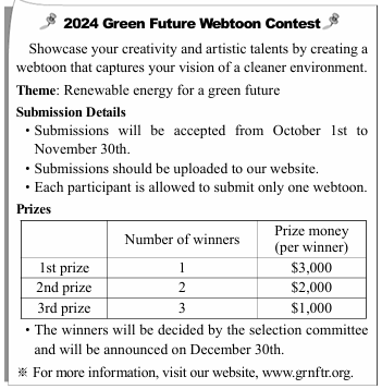 28. 2024 Green Future Webtoon Contest에 관한 다음 안내문의 내용과 일치하는 것은? ![]() ① 주제는 농업 기술의 미래이다. ② 출품은 11월 30일부터이다. ③ 각 참가자는 두 개의 웹툰을 제출할 수 있다. ④ 2등상은 세 명에게 주어진다. ⑤ 수상자는 선정 위원회에서 결정될 것이다 |